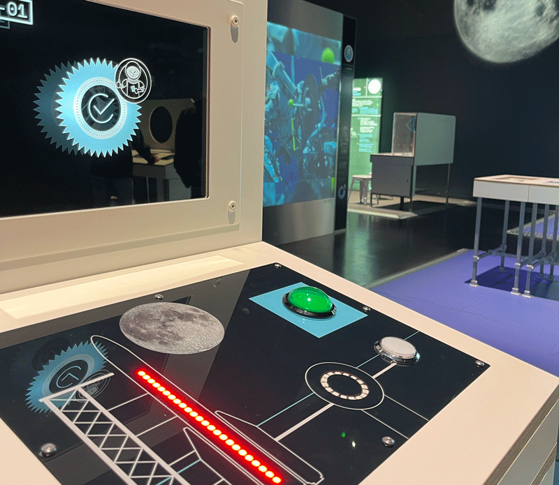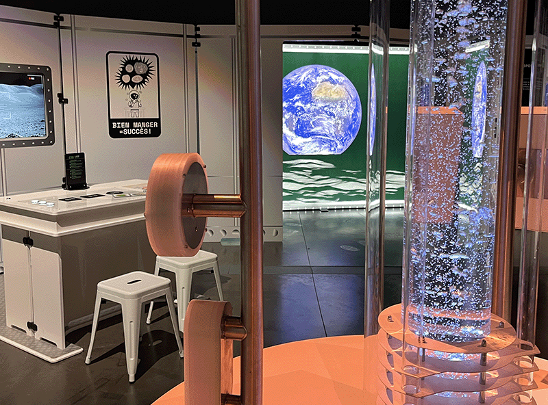 L’expo Lune reprend ces grands principes. En visitant, on manipule, on teste, on se déplace, on expérimente. On avance d’un module à l’autre comme un astronaute qui prépare sa mission en engageant l’attention et le corps. La scénographie crée un véritable parcours, où chaque dispositif devient une étape de compréhension.